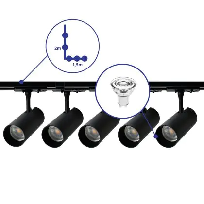| Nome del fabbricante | Complete L shaped 1-Phase Track Set Black incl. 5x Spot fixture + GU10 2700K 3W Dim – 1,5 x 2 meter | |